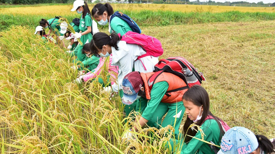明道大學有機農場辦食農教育 小小農夫收割稻米