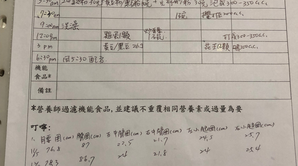 體重持續第二個月三公斤上升、減一餐因應,也配合外籍幫手離開不夠人力照顧。