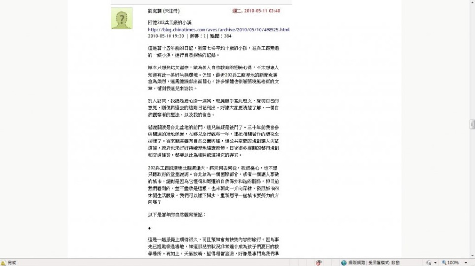 回憶202兵工廠的小溪 劉克襄十五年前的自然觀察筆記
