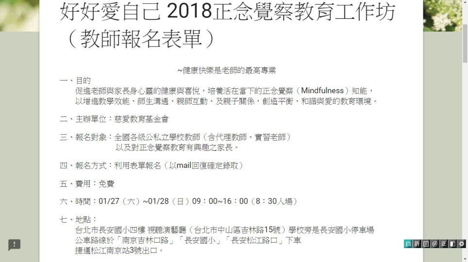 1/27(六)~1/28(日)好好愛自己正念覺察教育工作坊