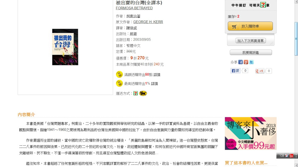 榮﹕柯喬治 George Kerr用台灣人的觀點寫被出賣的台灣《Formosa Betrayed》第一手資料寫1941年 ~ 1960年被當作「戰利品」的台灣