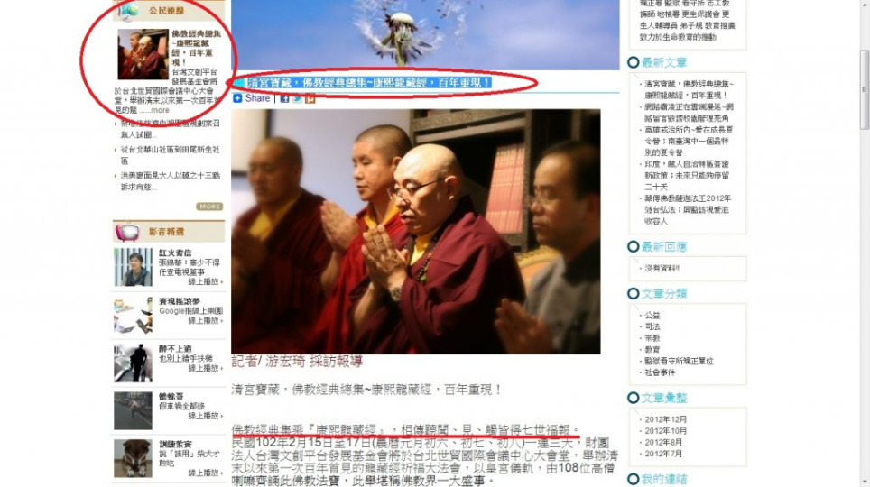清末以來第一次百年首見的龍藏經祈福大法會,以皇宮儀軌,由108位高僧喇嘛齊誦此佛教法寶,102年2月15日至17日台北世貿國際會議中心大會堂隆重登場! 全套龍藏經一百零八函經文可去除人世間的一百零八種煩惱並擁有七世福報!
