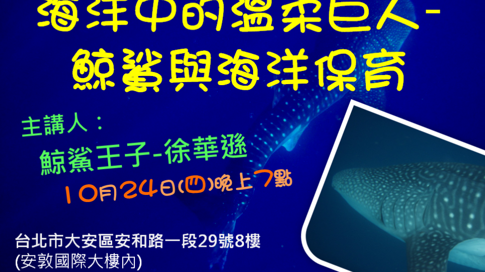 【扎根講座】海洋中的溫柔巨人--鯨鯊與海洋保育(免費)