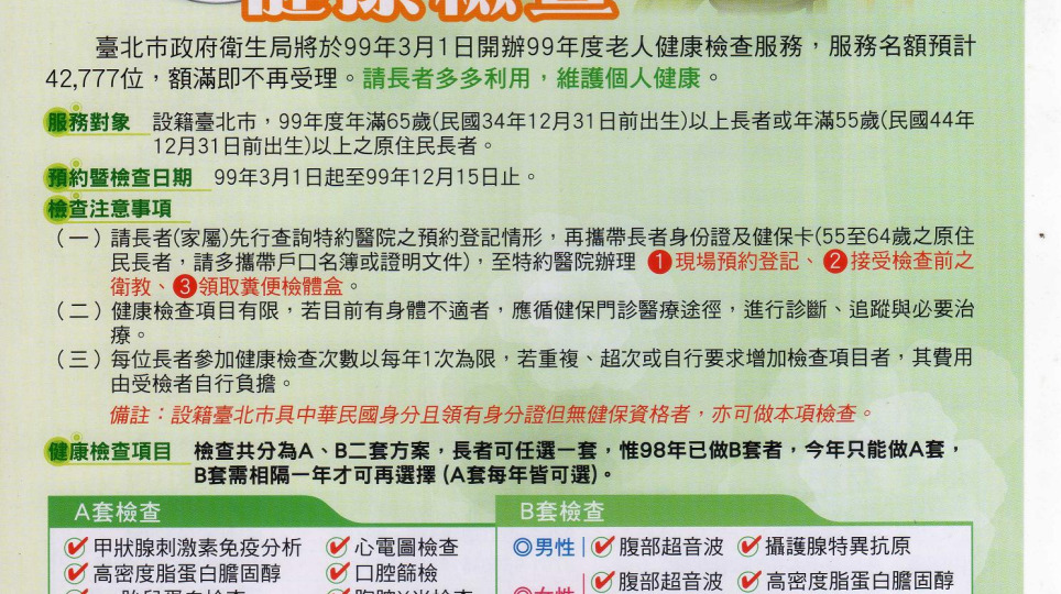 99年度臺北市老人免費健康檢查開跑了!