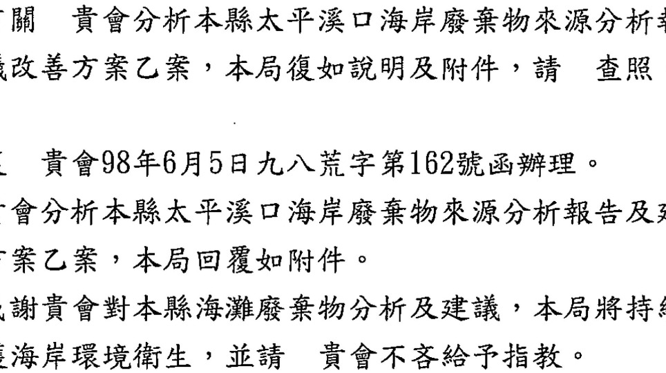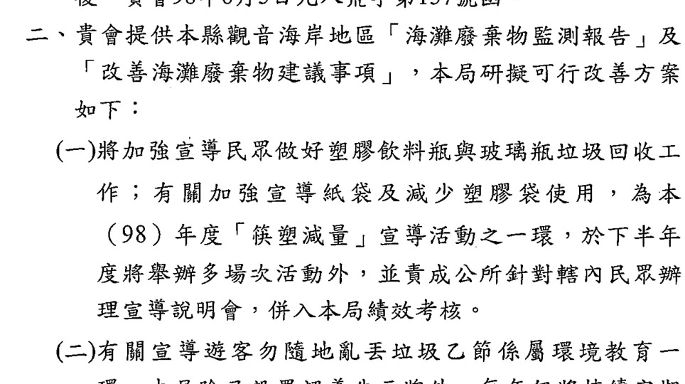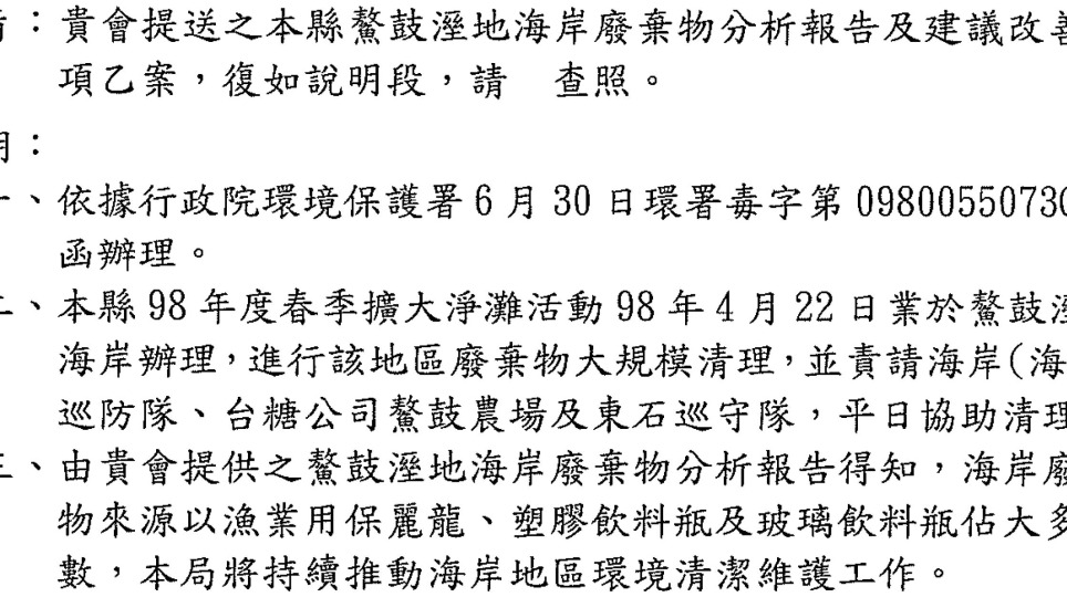 嘉義縣環保局的回應~2009地球日嘉義鰲鼓海廢資料