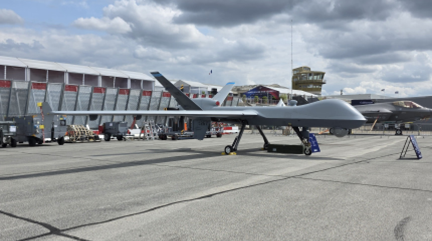 美國通用原子在2025年巴黎航展上展示MQ-9死神無人機與AGM-114地獄火飛彈