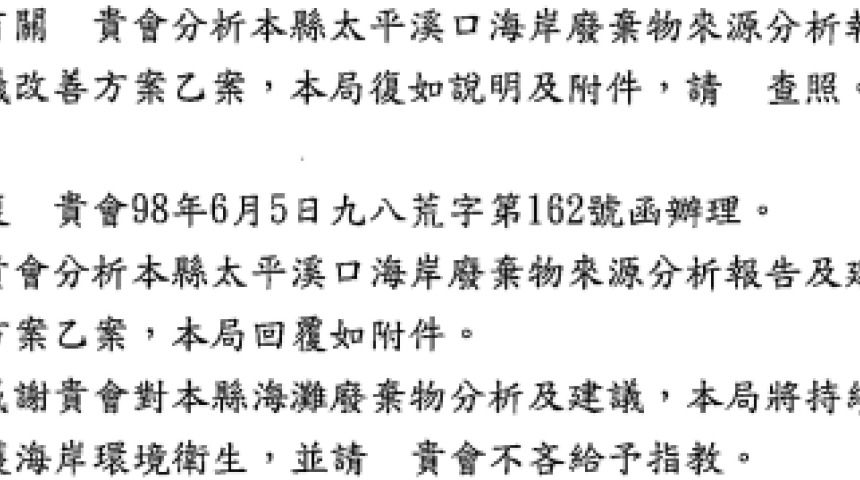 台東縣環保局的回應~2009地球日台東太平溪海廢資料