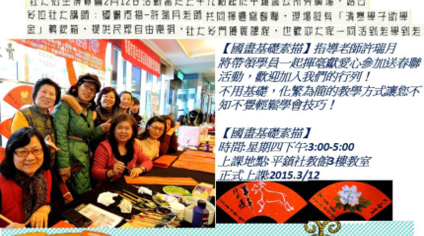2月12日【新楊平社區大學】《國畫基礎素描》指導老師許瑞月將帶領學員一起參加揮毫獻愛心送春聯活動。